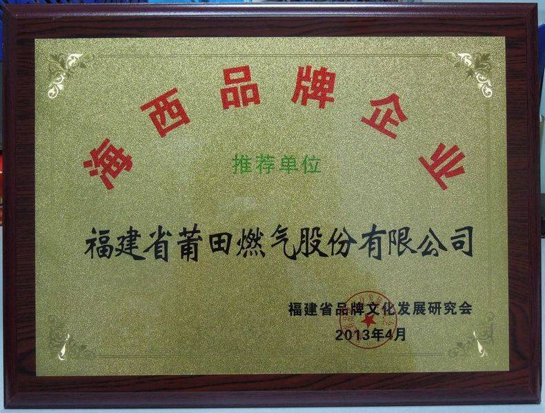 2013年04月 莆田燃?xì)獗桓=ㄊ∑放莆幕l(fā)展研究會(huì)推薦為 “海西品牌企業(yè)”