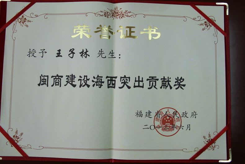 2013年06月 王子林董事長(zhǎng)榮獲“閩商建設(shè)海西突出貢獻(xiàn)獎(jiǎng)”榮譽(yù)稱號(hào)