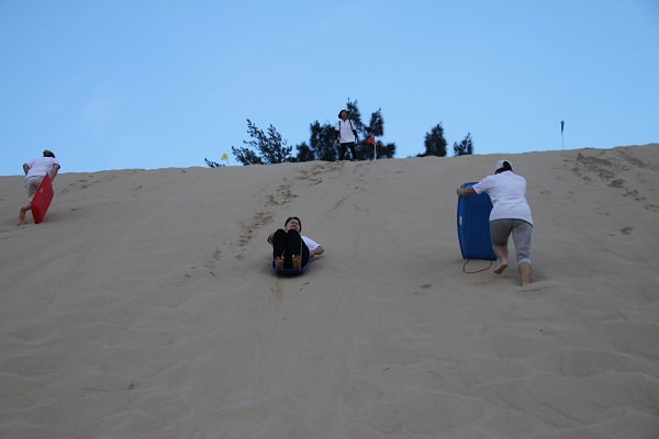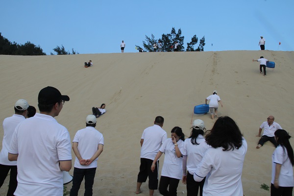 作為團建活動的第一個項目,滑沙比賽雖看似簡單,其實不易。比賽規則為:在陡峭的沙丘上,每隊的前一名隊員從沙嶺乘坐滑沙板下滑至山腳,后一名成員取走滑沙板后爬上沙丘再下滑,全隊成員依次完成接力,最先完成的隊伍獲勝。為了團隊榮譽,隊員們不顧沙丘上的阻擾,奮力拼搏,最終,蛟龍隊在該項目中取得勝利。精彩的比賽使得大家意猶未盡,于是現場臨時加賽,由每隊副隊長代表所在隊伍進行比拼,在該輪比拼中,風車隊勝出。