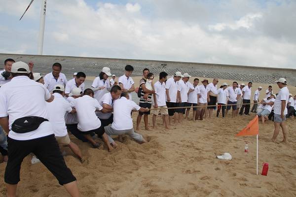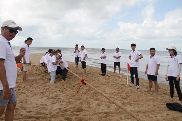 23日上午7:40,所有成員出發九重山,在九重山山腳下徒步至山頂,比賽規則為最先到達山頂的隊伍(全隊成員)獲勝。一行人員浩浩蕩蕩向著目標前進,一路上隊員們互相打氣、互相扶持,堅持走向了終點。海神隊以全員最快到達山頂的優勢取得該項目的勝利。緊接著,所有成員趕赴東戶黃金沙灘,開展沙灘拔河比賽。比賽過程中,所有成員勁往一處使,有人被拔河繩擦傷,有人摔倒在了沙灘上,但卻絲毫未動搖他們為團隊爭取榮譽的信念,他們將傷痛拋在了腦后,竭力爭取,最終,海神隊贏得了拔河比賽的冠軍。