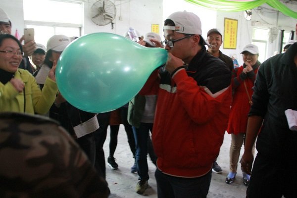 吃過午飯后,經過一個小時的休息,拓展活動繼續進行。下午的第一個活動為“牛皮吹破天”,要求各小組將所發全部氣球吹爆,總計時間最短的小組獲勝。裁判根據氣球頭數量核實戰績。游戲開始時,各小組的男士們紛紛發揮紳士風度,爭分奪秒,氣球爆炸聲此起彼伏,為了加強娛樂性,裁判組分別給每個小組分發一個大氣球,每次大氣球的吹爆過程都能引來隊員們的側目相看,隊員們臉上露出各異的表情,或驚奇,或興奮,或賊笑……