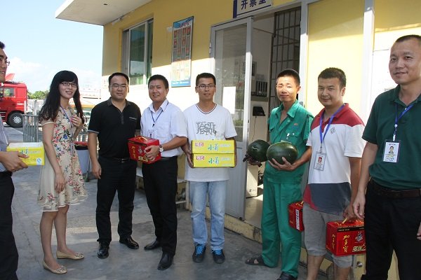2014年7月29日,由集團總裁辦、人力資源中心組成的高溫慰問團代表集團進行莆田區(qū)域的高溫慰問活動,為在戶外高溫作業(yè)的一線員工送去消暑慰問品,曠遠能源股份有限公司副總經(jīng)理黃劍鋒陪同慰問。